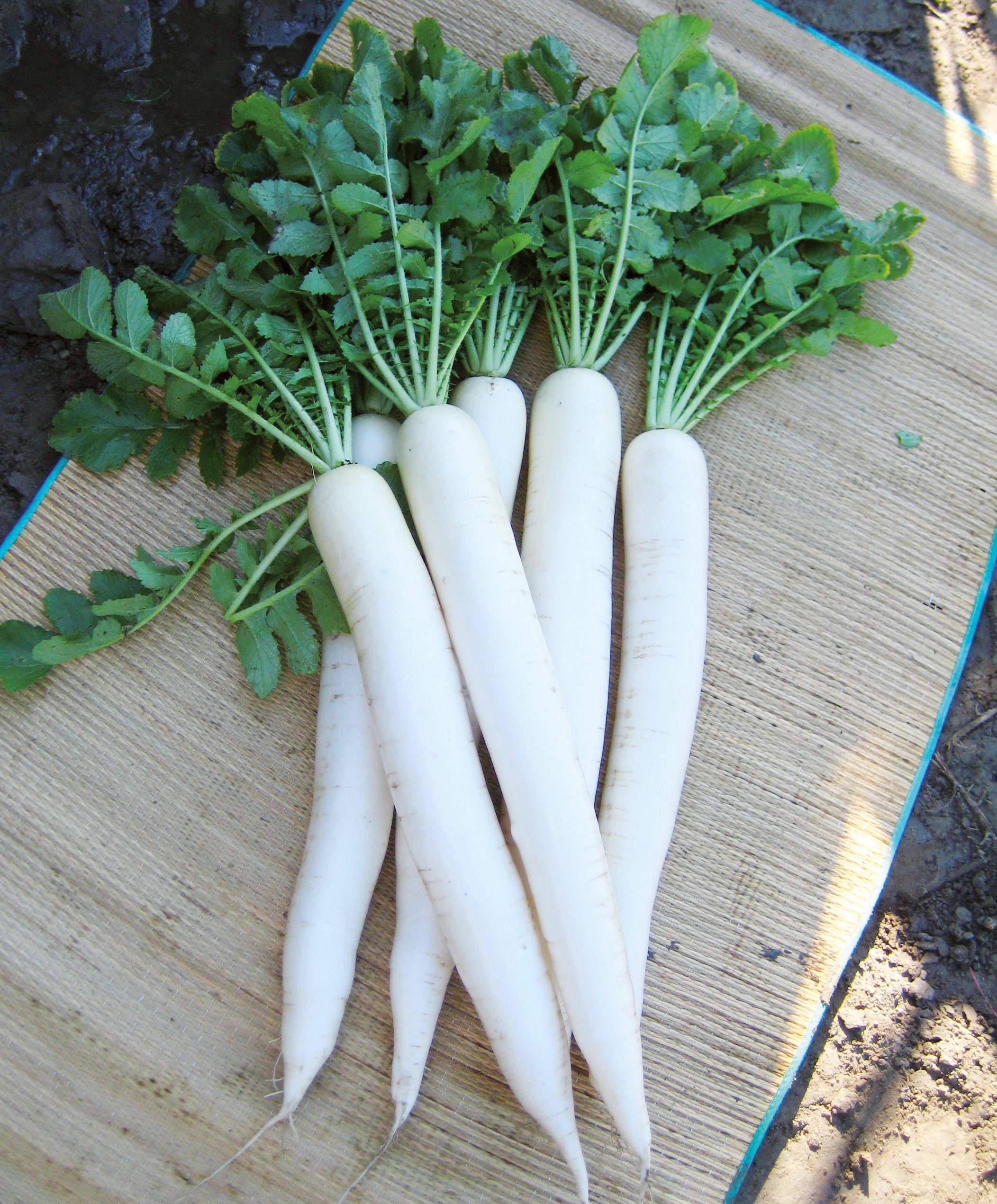 - Japanische Rettiche, lang und weiß (weiße Schale und weißes Fruchtfleisch)